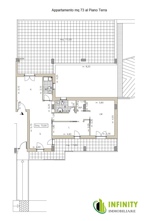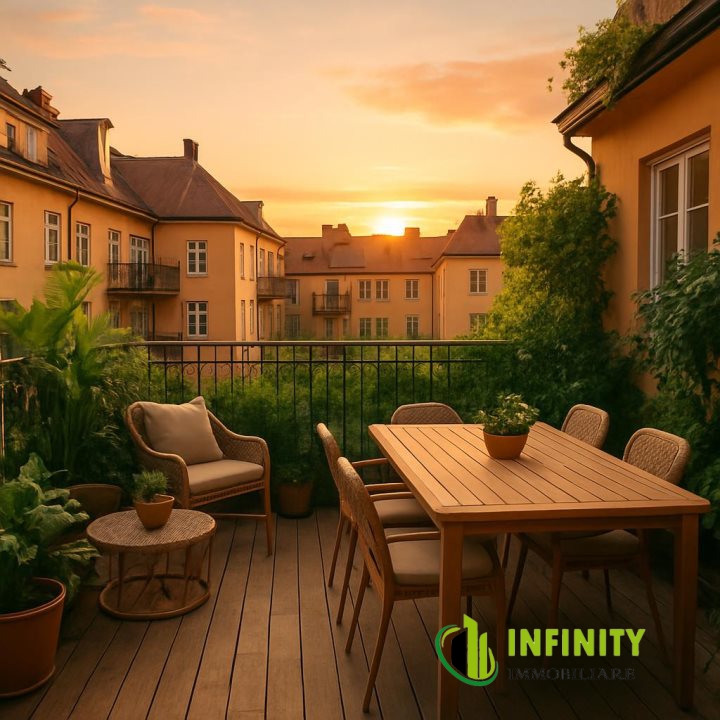 L'appartamento, di mq 73 con un terrazzo di oltre 77 mq, è ubicato all'interno di una struttura pensata e realizzata con elementi che garantiscono adeguati coefficienti energetici.